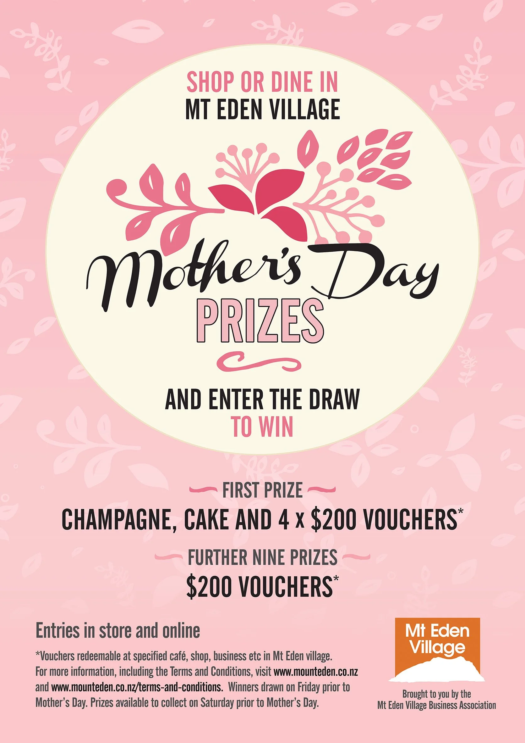 Scan the QR code in store & submit the online entry form or complete the paper entry form in store. Competition closes 10.30am on Friday 8th May 2026. Winners drawn on Friday prior to Mother’s Day. Prizes available to collect on Saturday prior to Mother’s Day. Brought to you by the Mt Eden Village Business Association. Terms and conditions apply.